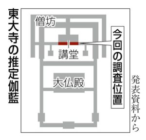 奈良時代に創建された東大寺(奈良市)の大仏殿北側にあった講堂の基壇の構造と規模が発掘調査で明らかになり、同寺が19日発表した。基壇は東西約61㍍、南北約36㍍と推定。同寺大仏殿に次ぐ規模といい、多くの僧侶が経典などを学んだ大型施設について知る成果という。