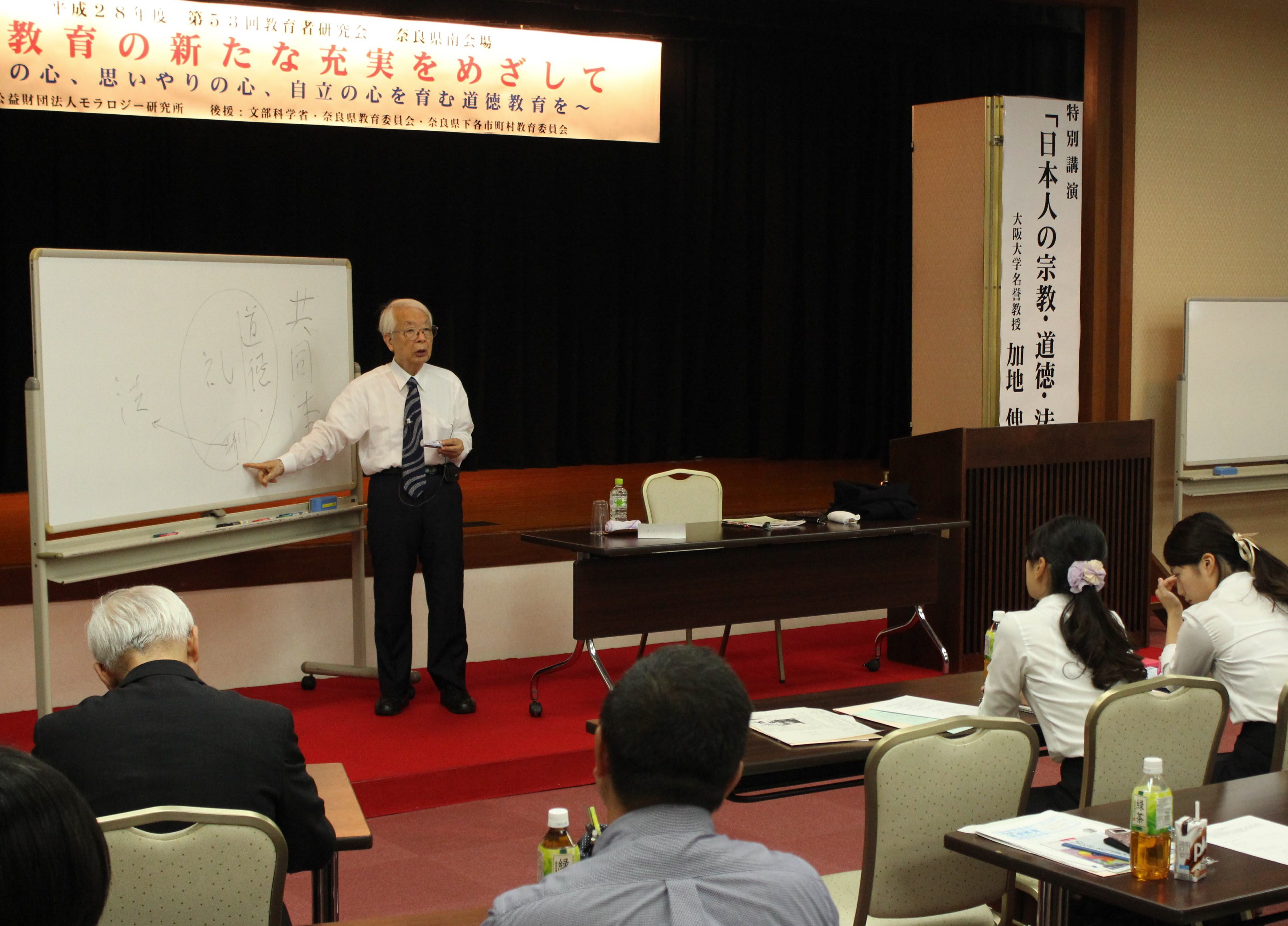 知識と道徳が一体となった教育のあり方を考える「第53回教育者研究会」が23日、奈良県広陵町のふるさと会館グリーンパレスで開かれた。平成30年度以降に「道徳」が小中学校で教科化されるのを前に、教職員らを中心に約125人が参加し、道徳教育の意義について考えた。