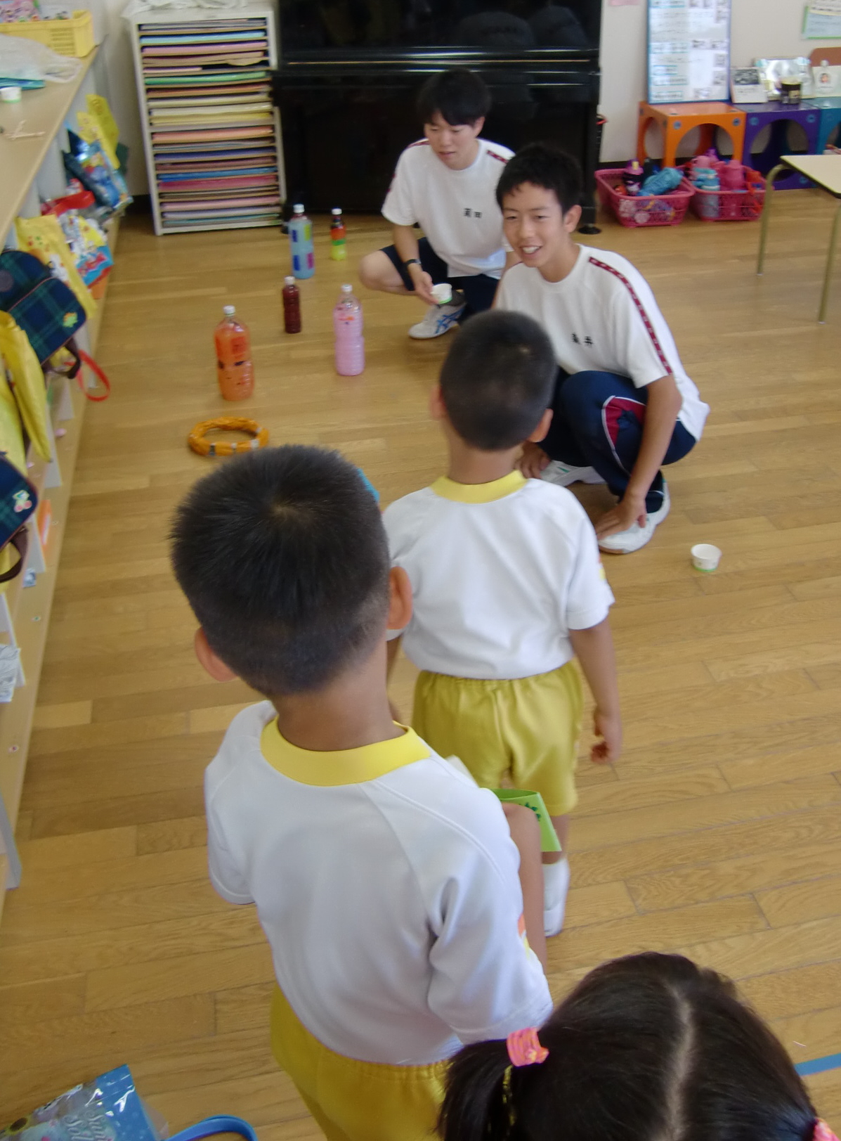 子供と接することで、生命や家族の重要性を理解し、地域との連携・交流を深めようと実施。1、2年生約20人が園を訪れ、保育士らの指導を受けながら、園児たちとゲームやお店屋さんごっこ、プール遊びなどを楽しんだ。