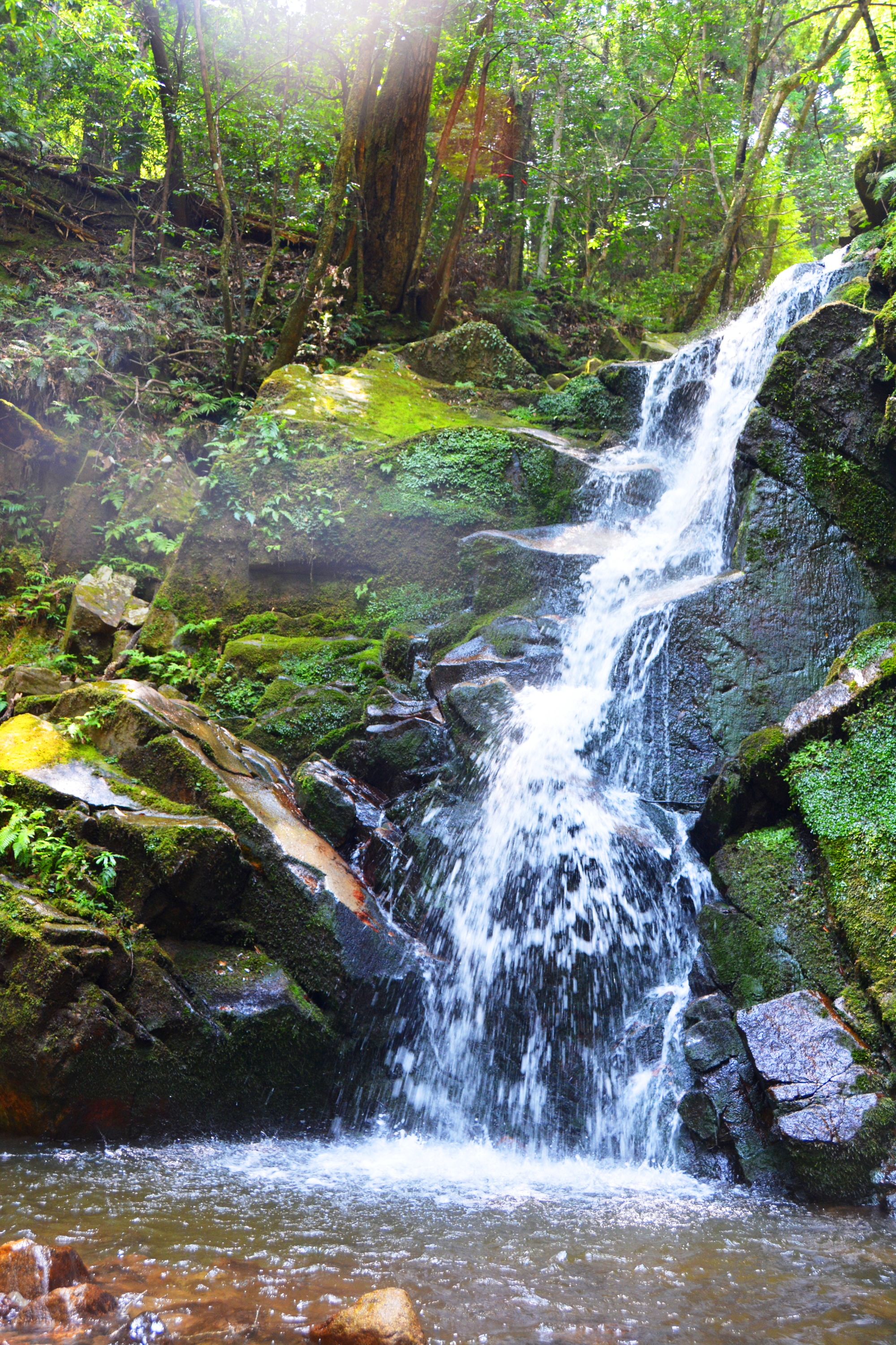世界遺産・春日山原始林(奈良市)。スギやヒノキの大木の間を抜け、木漏れ日の中を進んだ先に「鴬の滝」がある。