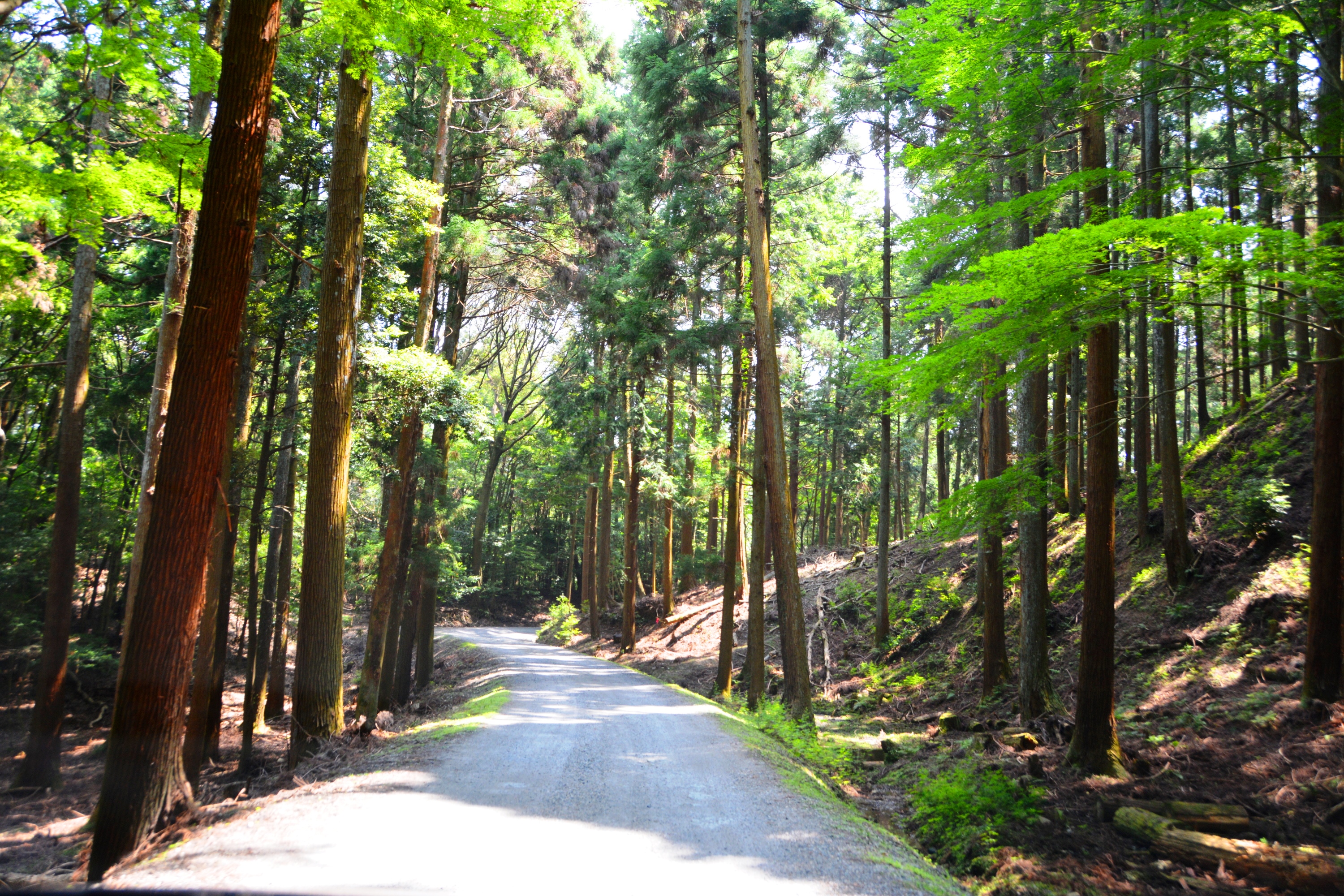 鴬の滝に向かう道中は、スギなどの大木が建ち並び木漏れ日が差し込んでいる