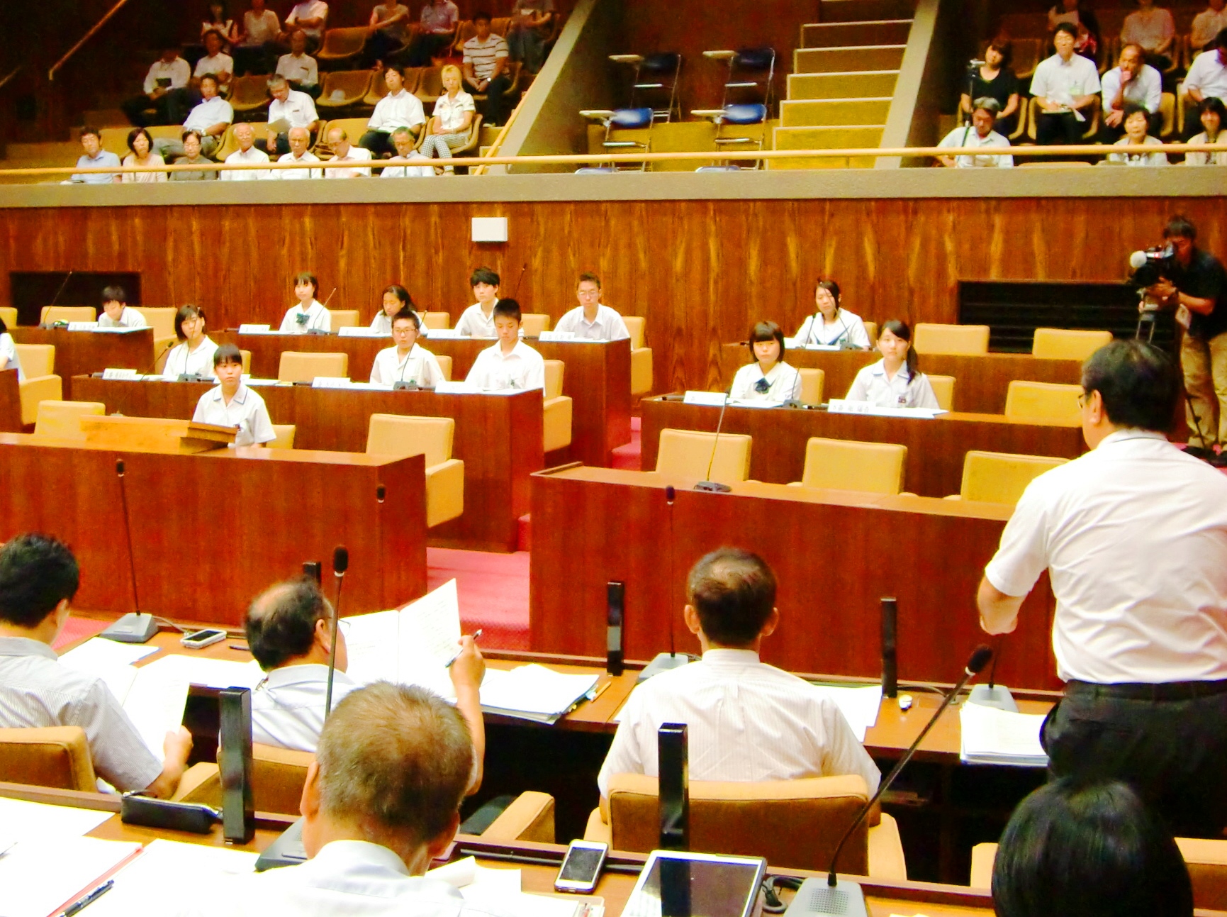 市立香芝東、香芝北、香芝西、香芝の4中学校から生徒会役員ら3人ずつが参加。生徒たちは、市の交通事故防止対策や選挙権年齢の引き下げ、市が一番力を入れている施策などについて質問し、担当部長らが答弁した。