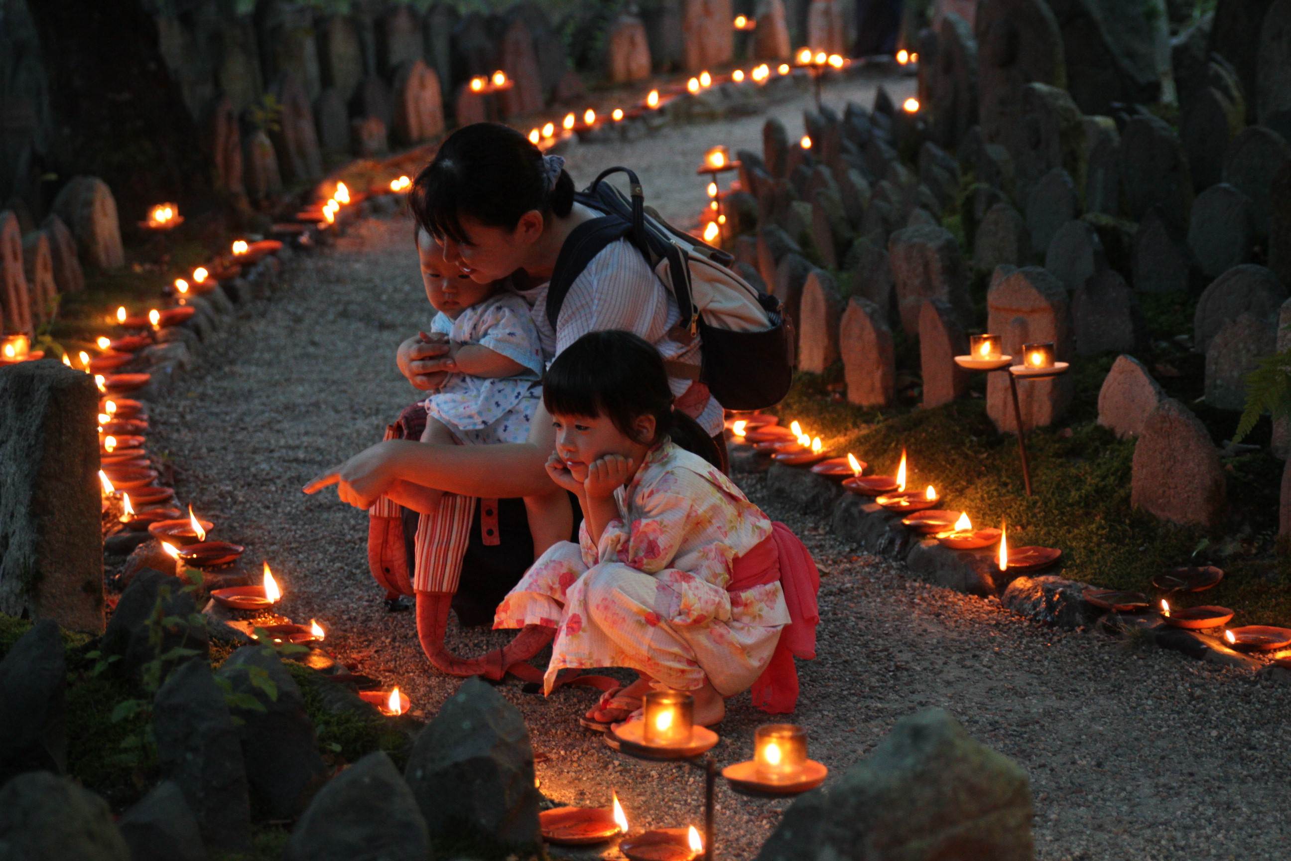 23日は、夕方から境内にある約5千基の石仏、石塔の前に「健康長寿」「家内安全」などの願いが書かれた灯明が並べられ、訪れた人たちが手を合わせていた。午後5時からは極楽堂(国宝)で、地蔵尊供養の法要なども行われた。