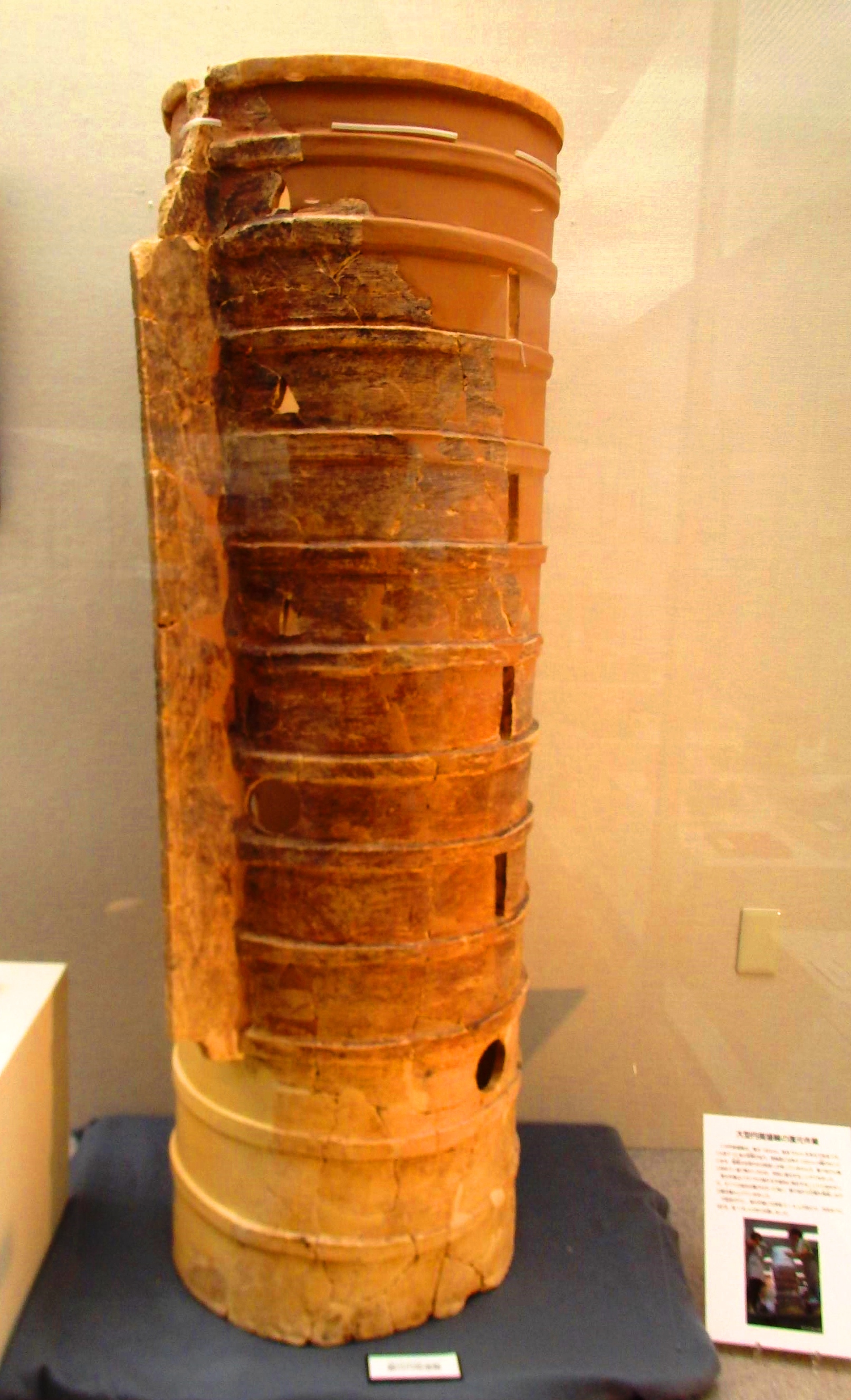 展示品のうち、航空自衛隊奈良基地(奈良市)敷地内の佐紀古墳群で見つかった鰭付円筒埴輪は直径約50センチ、高さ約1・6メートル。ウワナベ古墳(5世紀)の濠のまわりに立てられていた可能性もあるといい、巨大古墳の埴輪にふさわしい大きさ。破片の状態で出土し、1カ月以上かけて復元した。