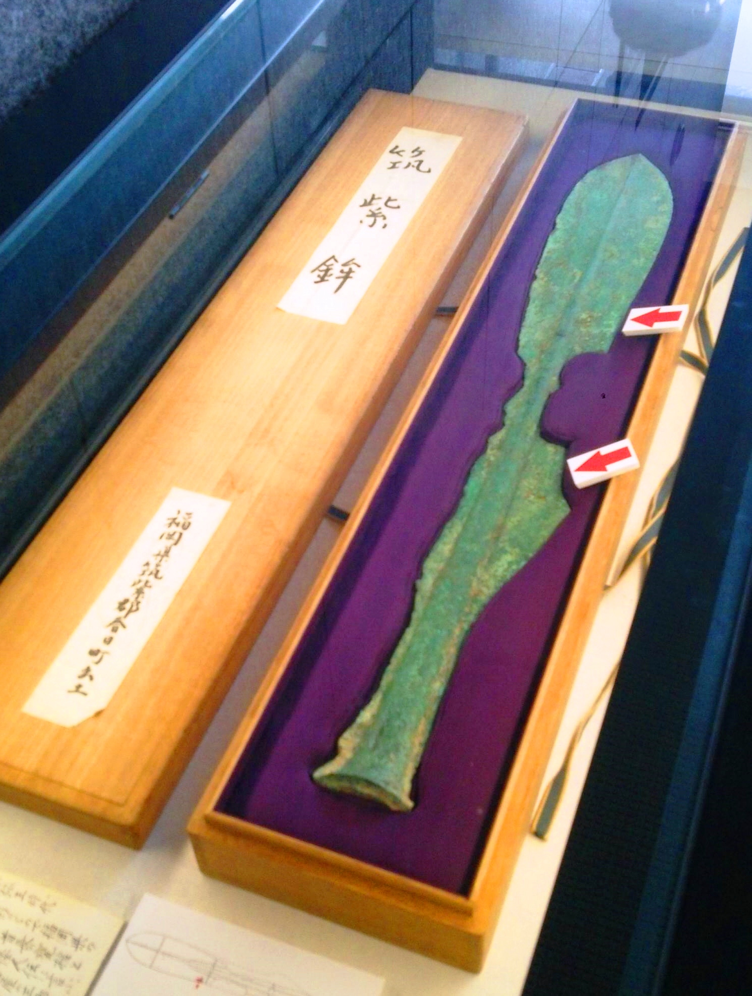 展示されている銅矛は、広形銅矛と呼ばれるタイプ。弥生時代後半の遺物で、長さ84・7センチ、幅11・5センチ、重さ1・96キロ。鋳造欠陥部分を後から補修した個所が2カ所あり、展示では赤い矢印で示している。
