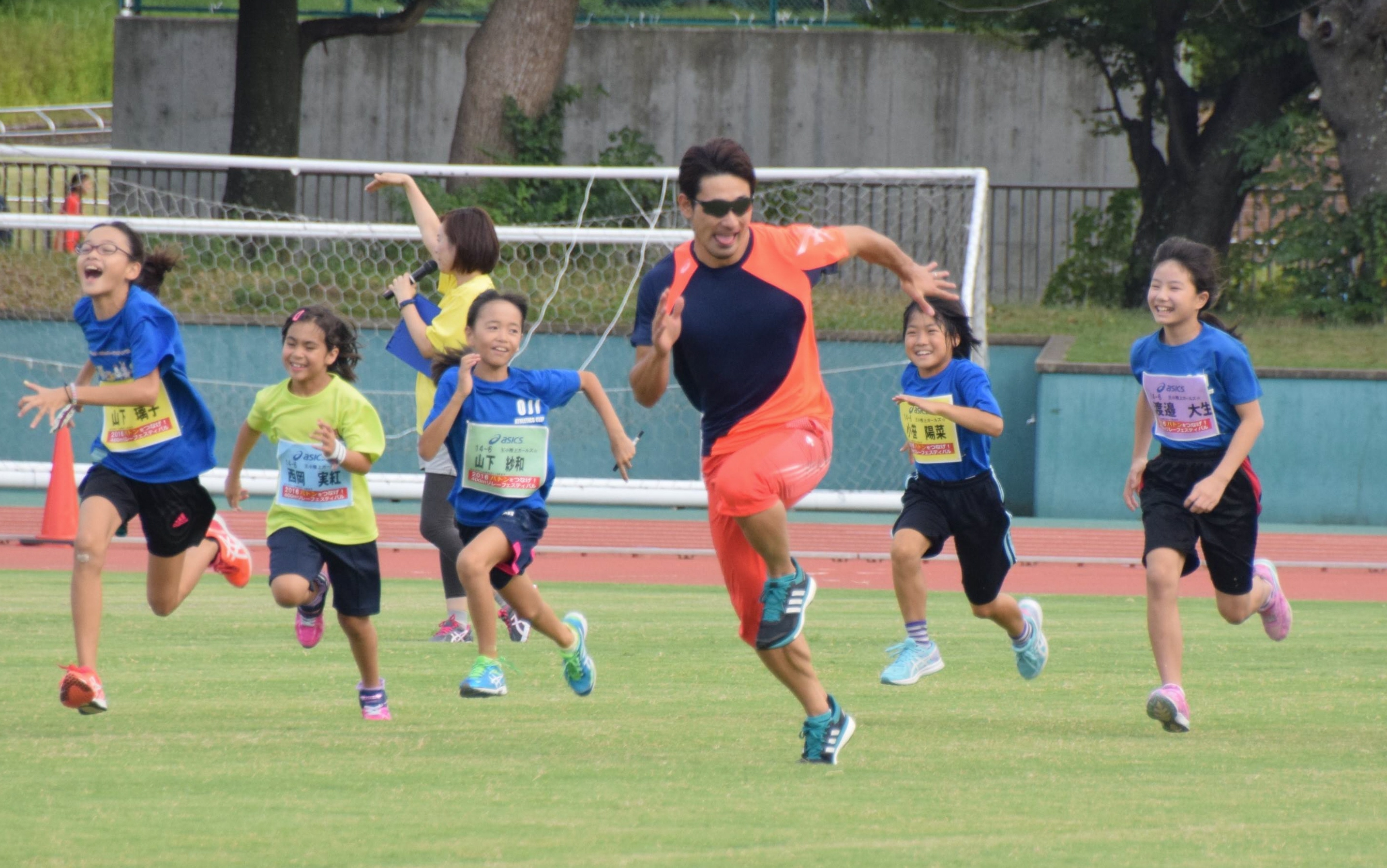 トップアスリートの走りを間近で見て、体を動かすことの楽しさを知ってもらおうと平成25年から開催。開会式では、大会会長をつとめる北京五輪陸上400メートルリレー銅メダリストの朝原宣治さんが「リオ五輪の400メートルリレーの記録を塗り替えるような気持ちで、楽しんで走ってください」とあいさつ。