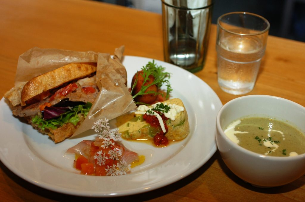 2種類あるサンドイッチは週替わり、おかずは日替わりだ。取材時は、パリッと香ばしいパンでたっぷりの具をはさんだ「豚肩ロースとなすのグリルスパイシートマトソースサンド」。おかずはスペイン風オムレツの「ズッキーニのトルティージャ」や「生ハムのクリームコロッケ」、栄養たっぷりの「ケールのポタージュスープ」など盛りだくさんだった。