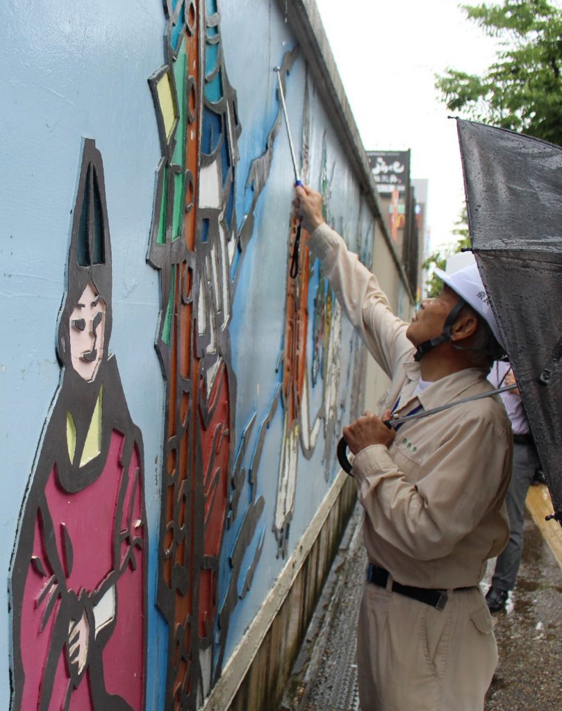 奈良市立大宮小学校の校舎を囲む塀に異常がないか確認する市職員