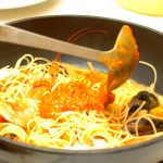⑧フライパンに少し硬めにゆでたパスタ、魚介類、⑦のトマトソースを入れ=写真❼、蓋をして火にかける