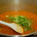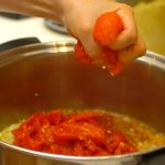 ④トマトを粗めに切るか手で潰し=写真❸、③に入れる