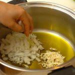 ③玉ねぎ、ニンニクをみじん切りにし、オリーブオイルと鍋に入れてから=写真❷、火をつけ中火で炒める