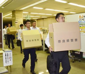 葛城市役所の家宅捜索で関係書類などを押収する捜査員=同市