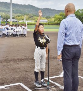 平和レッドスワローズ(郡山)の上原愛絆副主将(11)が開会宣言を行った後、選手を代表して、城ケ丘エンゼルス(郡山)の佃夢大副主将(11)が「仲間を信じ、最後の一球まで全力でプレーすることを誓います」と力強く宣誓した。