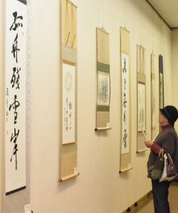 南部会長は「濃淡の表現が豊かな拓本をぜひ見てほしい」、万葉書道会の白記佑紅会長は「拓本に自作の書を添える作品が増えてきた。会員が楽しく一生懸命に作った作品を見に来てもらえたら」とアピールしていた。