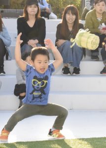 この日は、小松菜やホウレンソウ、柿といった農産物が販売されたほか、収穫されたばかりの新米の量り売りもあった。また、米俵を投げて飛距離を競う「俵―1グランプリ」も実施。男性は重さ9㌔、女性は4㌔、小学3年生以下の子供は1・3㌔の米俵をほうり投げ、各部門の優勝者には㌔のお米が贈られた。