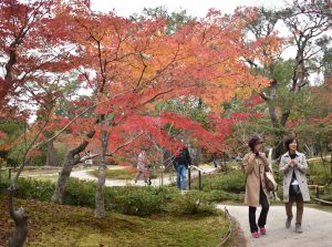 見頃を迎えた紅葉を楽しむ来園者=奈良市の依水園