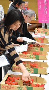 「あすかルビー」や「古都華」など、今シーズンの県産イチゴのできばえを競う品評会が22日、大和郡山市の中央公民館で開かれ、審査員らが甘い香りを放つイチゴを観察したり味わったりして見定めていた。