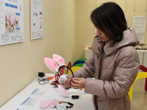 「うさ耳」は、体の動きが小さく意思表示が難しい障害者のためのカチューシャ型のコミュニケーションツール。奥歯のかみしめなど筋肉の収縮で発生する微弱な電気信号を耳の動きに変換し、意思を伝える仕組みだ。