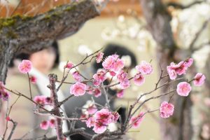 菅原天満宮「盆梅展」 早咲きの梅は満開に