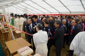 平成29年7月からJR三輪駅東側の境内地に建設中で、今秋完成予定。この日は祝詞奏上の後、棟木を設置するための「槌打の儀」や「曳綱の儀」などを行い、工事の無事を祈った。