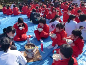 同校では、新入生の歓迎と親睦を図る目的で、昭和35年から続いている恒例行事。今年も新入生約200人と2、3年生、教諭らが参加。校庭に敷いたビニールシートに七輪を置き、上級生らが鍋に牛肉と白菜、糸こんにゃくなどの具材を入れ、すき焼きを作った。