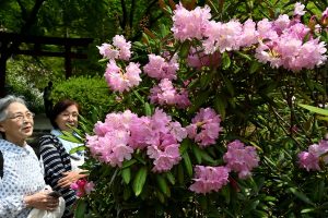 明日香村の岡寺で約3千株のシャクナゲが見頃を迎え、参拝客の目を楽しませている。
