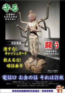 県警は特殊詐欺による被害を防ごうと、興福寺(奈良市)の国宝・阿修羅像を使った啓発ポスター5千枚を作製した。「(3つの顔と6本の腕を持つ)阿修羅像のように複数の視点で詐欺に気をつけて」との意図を込めており、来月30日までポスターの掲示先を募集している。