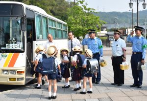スクールバスに乗り込む児童を見守る香芝署員ら=香芝市