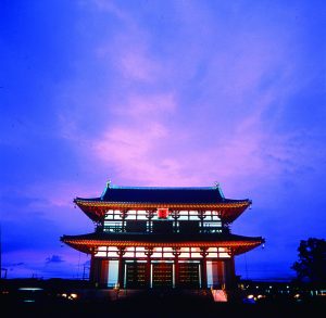 ライトアップされた平城宮跡の朱雀門=奈良市(奈良県提供)