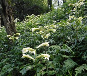明日香村の国営飛鳥歴史公園甘樫丘地区で、大型のユリ「ウバユリ」(姥百合)が開花し、園路沿いで緑白色の美しい花を咲かせている。