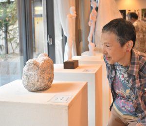 展示会では、県立高円高校(奈良市)や県立高等養護学校(田原本町)の生徒が石を削って制作した彫刻のほか、プロの芸術家が手がけた絵画やオブジェなど計22点が交流サロンと中庭に並んでいる。