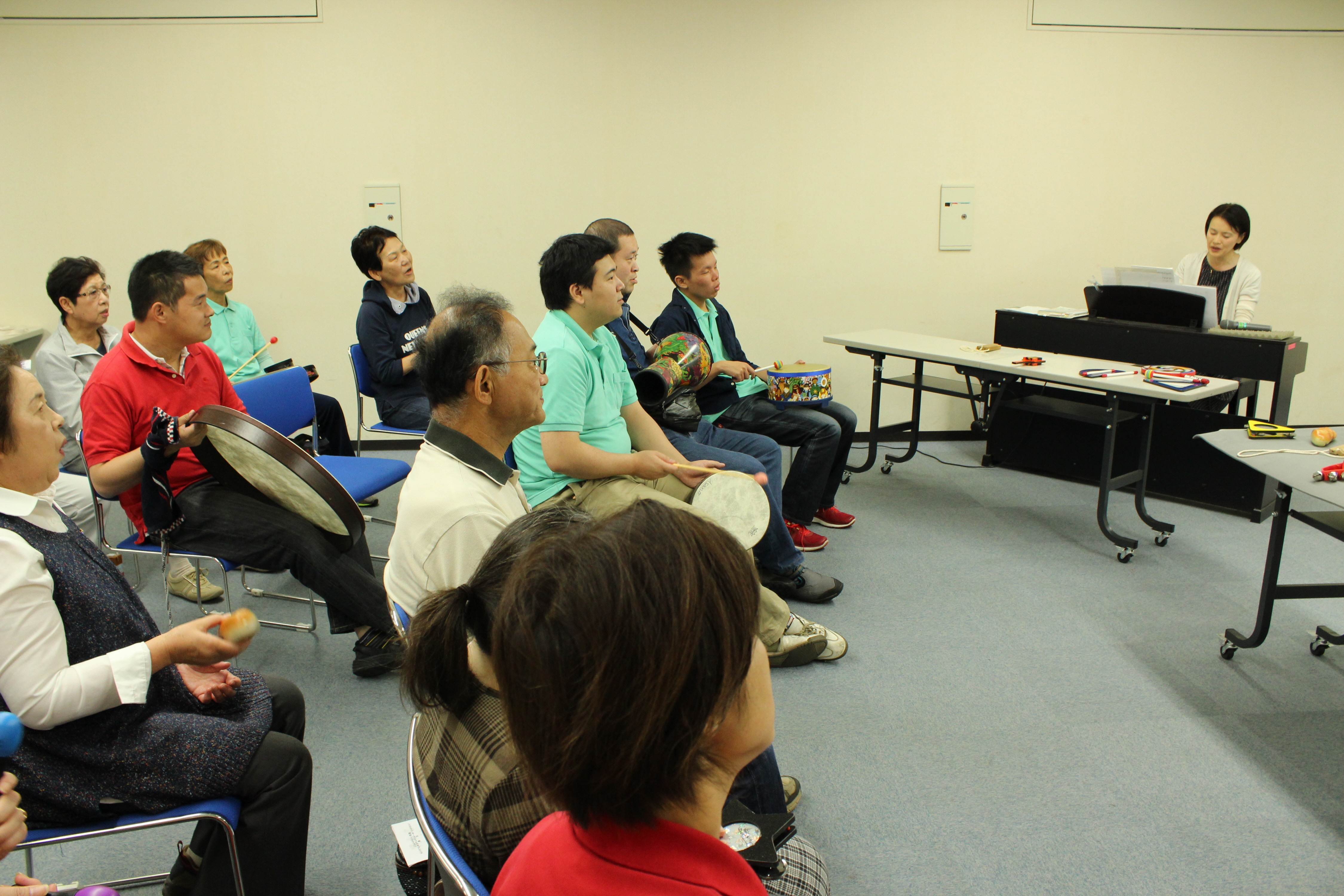 この日は、「歌って歩いて健康づくり」をテーマに、参加者たちは音楽療法士が弾くピアノに合わせて歌う指導を受けた後、プラカードや横断幕を持って歩き、支援を求めた。