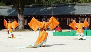 久米舞は神武東征の際、勝利を祝う兵士が勝ちどきを上げて舞ったのが起源とされ、宮中の儀式で行われる歌舞の一つ。橿原神宮には平成の御大典の際に宮内庁から伝授されたという。