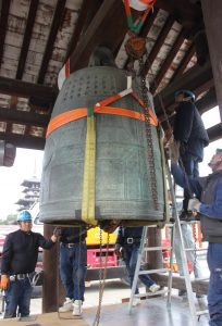梵鐘は高さ約2㍍、口径約1・3㍍、重さ約3㌧。鐘楼への設置は33年ぶりで、解体修理中の東塔(国宝)が来春に落慶法要を迎えることを記念した。