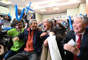 徳勝龍の優勝が決まり、喜びを爆発させる父の青木順次さん(前列左から2人目)