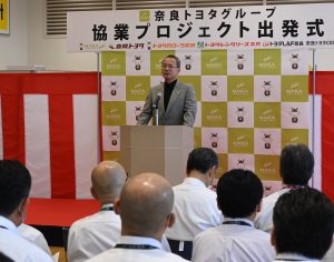 奈良トヨタグループは1日、奈良市の奈良本社で、奈良トヨタ自動車とトヨタカローラ奈良の移転統合に伴う協業プロジェクト出発式を開催した。両社の営業や総務などの本社機能を統合したことで、より迅速なサービスが実現できるという。