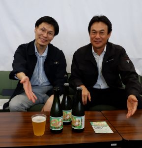 大和茶ビールを共同開発した、奈良醸造の浪岡安則社長(左)とティーファーム井ノ倉の井ノ倉光博社長=奈良市