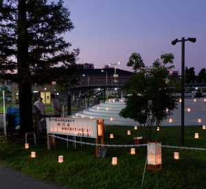 天理市の天理駅前広場コフフンで今月17、18の両日夕、「ミニ柳灯会」が開かれ、ろうそくと行灯(あんどん)のやわらかな明かりが駅利用客らの目を楽しませた。