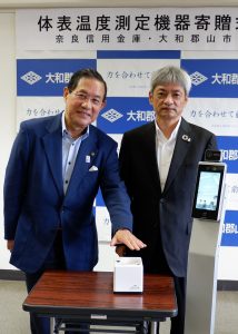 奈良信用金庫(大和郡山市)は21日、地域貢献の一環として、大和郡山市にAI(人工知能)による顔認証機能を搭載したスタンド型の検温器と自動消毒液噴霧器を各2台ずつ寄贈した。