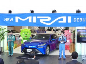 トヨタ自動車が全面改良した燃料電池車のセダン「MIRAI(ミライ)」を9日に発売したのにあわせて、県内でも奈良市の奈良トヨペット南京終店で発表会が開かれた。