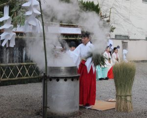 大宿所は精進潔斎が行われてきた参籠所で、御湯立は大和郡山市の巫女、加奥満紀子さんが作法を継承している。冷え込んだこの日、午後4時半頃から、加奥さんは煮え立つ大釜の湯に酒や米などを入れ、「左右左」と唱えながらササの葉で湯を振りまいて清めた。