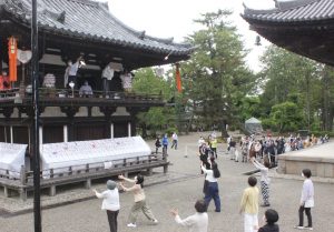うちわまきは、覚盛上人が蚊をたたこうとした弟子を戒めたことから、上人の死後に蚊をはらううちわが供えられたことが始まりと伝わり、例年は多くの参拝者が訪れる人気行事だ。今年は境内の鼓楼から僧侶がハート形のうちわ(宝扇)約50本を間隔を開けて待つ関係者らに向かってまいた。うちわは長さ約40㌢で、魔よけなどになると伝えられている。