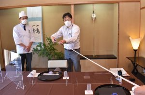 認証を受けた河合町の懐石料理店「西大和さえき」ではこの日、県職員らが感染防止対策をチェック。パーテーションの設置など対策が徹底されていることから、同店の佐伯誠紀社長に認証書と認証ステッカーを手渡した。