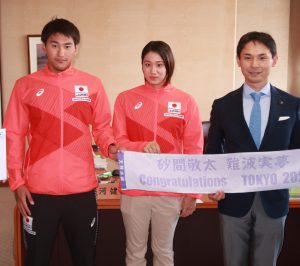 競泳の東京五輪代表で、ともに天理高校出身の砂間敬太(26‖イトマン東進‖、難波実夢(19)‖MGニッシン、近畿大学‖の両選手が日、天理市役所に並河健市長を表敬訪問した。それぞれ、「奈良が盛り上がる結果をもって帰りたい」「自己ベストと決勝進出を目指す」と抱負を語った。