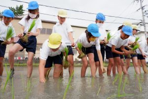 堀内瑛心さん(10)は「昔の米づくりは大変だなと思った。稲刈りが楽しみ」。竹林龍之介さん(10)は、「田植えは初めて。将来は機械でブーンとやって、理想の米を作る」と笑顔で話した。