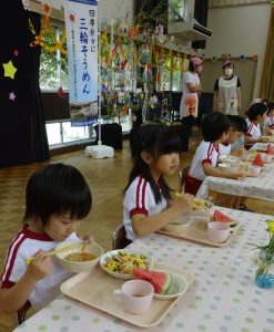 市立第3保育所では七夕の集いの後の給食に、ちらし寿司、スイカとともに冷やしそうめんが登場。女児(5)は「家でもよく食べる。おいしかった」と話した。