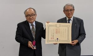 紺綬褒章と賞状を手にする門田充幸さん(左)=大淀町