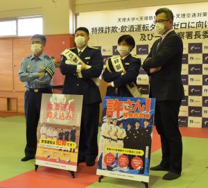 同署の小畑浩康署長は「正面から組み合う『天理柔道』のように、しっかり地に足をつけた対策を講じたい」。河内主将は「一人でも多くの人にポスターを見てもらい、気を付けてほしい」と話した。