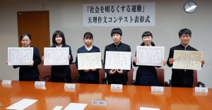 小中学生を対象とする「社会を明るくする運動 天理作文コンテスト」の入賞作品が決まり、天理市で表彰式が行われた。