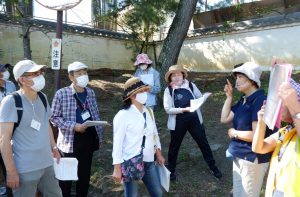 観光ガイド養成講座で説明を受ける山中輝章さん(左)と永井一江さん(中央)=大和郡山市